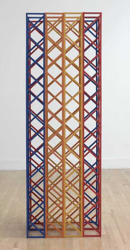 Interwoven strips form the structure of Rasheed Araeen's Rang Baranga 1969. Before becoming an artist Araeen worked as an engineer, and the carefully constructed pillars of his sculpture reflect this engineering background. The geometric shapes formed by the interwoven strips of painted wood also suggest the repeated geometric patterns found in Islamic art and architecture in Araeen’s native Pakistan.