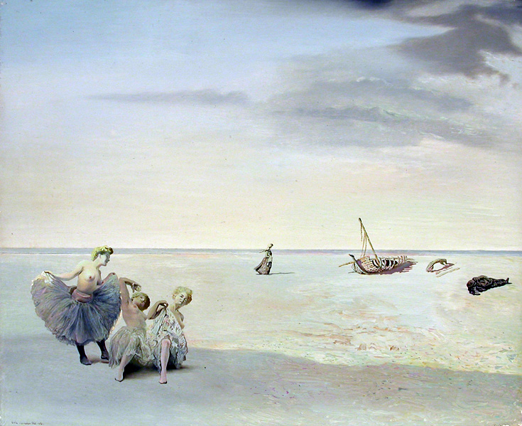 Dalí’s oil painting technique is based in tradition, but he combined materials and methods in a manner unique to him. In this work, Dalí first painted the setting of the sky, water and sand over white priming. Then he added the figures of the dancers which seem to float in the landscape.