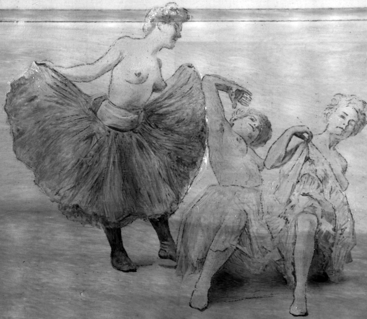 The source for the dancers is reported to be a postcard, now lost. From the information gained by examining the painting with infra red light, conservators were able to determine that Dalí transferred the image on the card to the panel, outlining the figures, the internal contours and facial features.