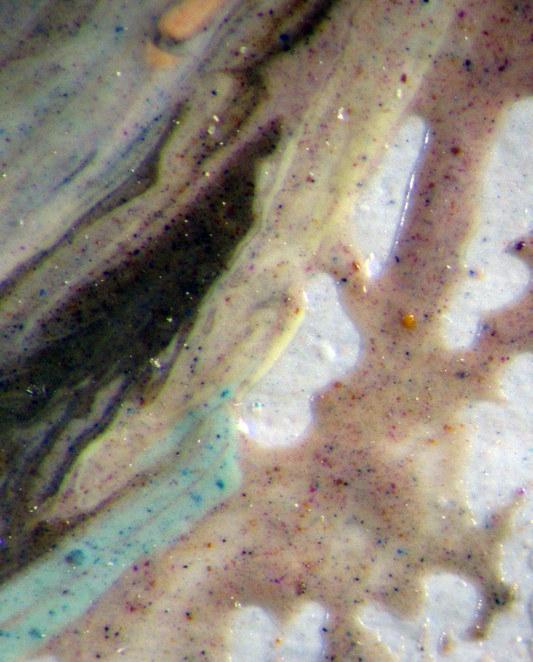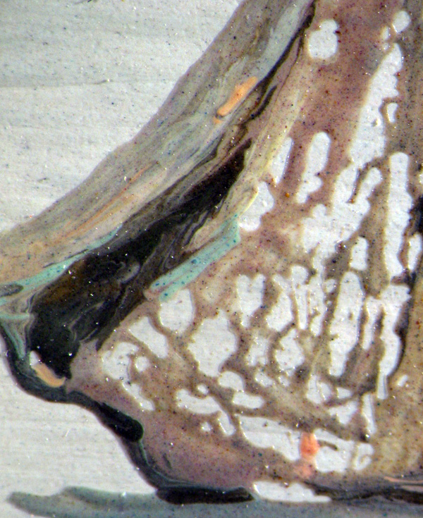 A detail of the head of the far left figure in the group was taken using raking light. The texture and energy in the paint application that is apparent in this detail, belies the flat, calm appearance of the work as seen from a normal viewing distance.