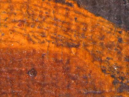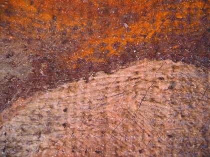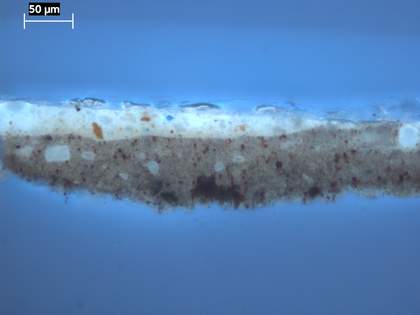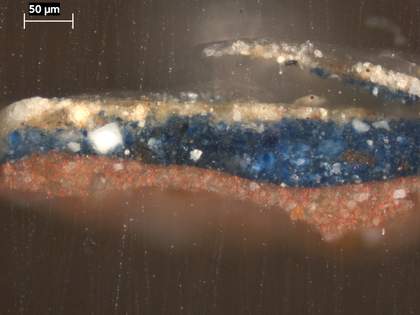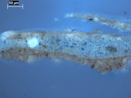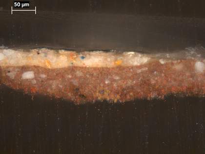 Cross-section from orange coloured sky, photographed at x320 magnification. From the bottom: brown ground, maximum thickness 80 microns; orange sky paint, 20 to 40 microns thick; synthetic resin varnish