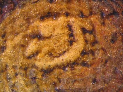 The oil-bound ground is purplish brown (figs.3–4). It is opaque and contains vermilion, a range of earth pigments, lead white, Cologne earth, bone black, a large proportion of chalk and traces of kaolin and talc. The ground was deliberately left visible to depict warm shadows in the composition (fig.5). There is no priming.