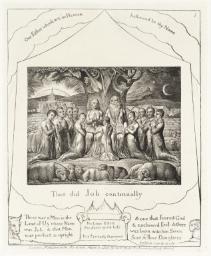 "description": "<p>This illustrates verses 1-3 of chapter 1 of the Old Testament Book of Job. Job is prosperous and pious. However, he is guided by the books of the Law which lie open before him. The instruments which should be used for praising the Lord hang silent above him. Satan tells the Lord that Job's piety stems from his material prosperity. Satan is allowed to test Job by destroying this prosperity. Job's subsequent trials which make him recognize his error of being pious only according to the law, are depicted in Blake's set of Job engravings. Blake's interest in depicting Job's trials is paralleled by his later exploration of Dante's experiences in the illustrations to the Divine Comedy. Some of these are included in this display.</p><p><em>Gallery label, August 2004</em></p>",