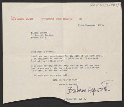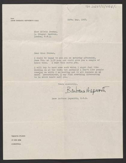 - Milein Cosman and Barbara Hepworth corresponded to make arrangements for Hepworth sitting for Cosman.