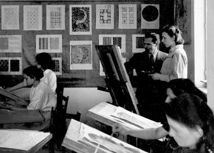 Artist (standing) at secondary school for plastic arts, Gdynia, Poland. Photo © Fundacja Marty Magdaleny Abakanowicz Kosmowskiej i Jana Kosmowskiego. (1948–9)