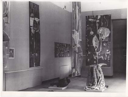 Wystawa prac Magdaleny Abakanowicz-Kosmowskiej (Exhibition of works by Magdalena Abakanowicz-Kosmowska), at Galeria Kordegarda, Warsaw. Composition 1960 is shown freely hanging to the right. Photo © Fundacja Marty Magdaleny Abakanowicz Kosmowskiej i Jana Kosmowskiego. (1960)