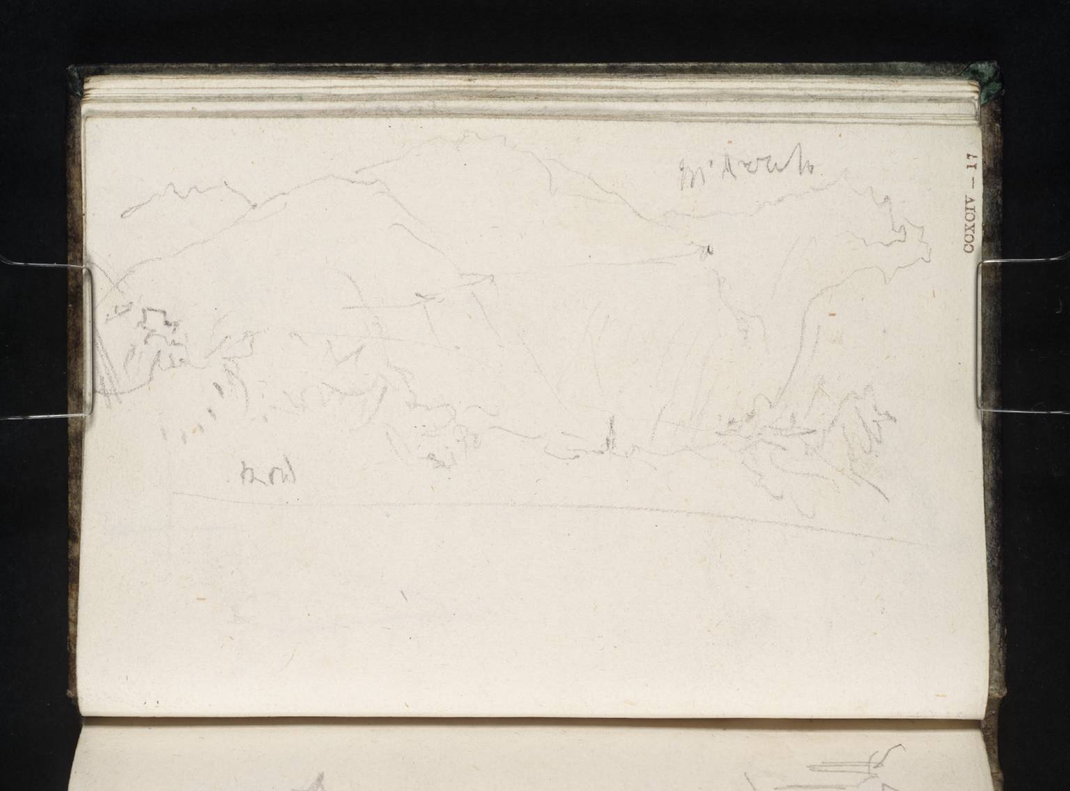 This page was numbered as the recto by Finberg, who appears to have missed the original blue ink numbering, possibly by John Ruskin, treating the opposite side (otherwise blank) as the recto, and was stamped with a Turner Bequest number accordingly. It has since been rebound, in its correct orientation, as folio 18 verso.