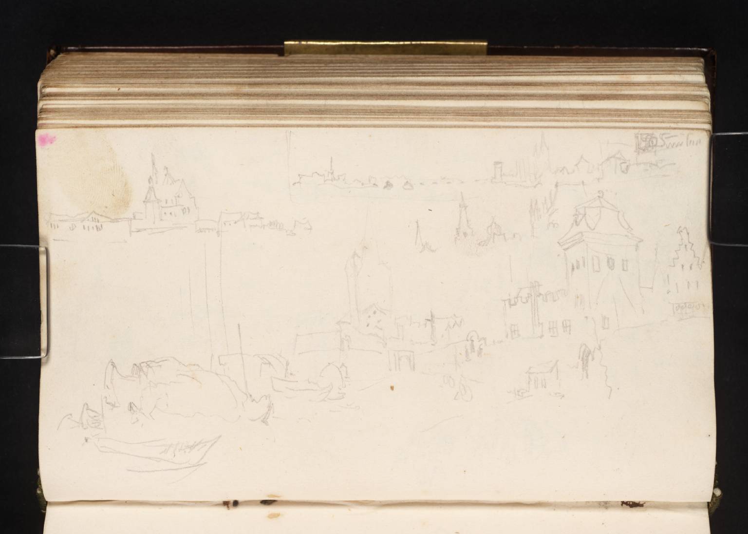 Powell observed that the painting was ‘based – both in its general plan and some of its specific details – upon recent sketches of that city’ in this sketchbook;4 see also folios 142 verso and 143 recto (D19121–D19122), respectively a study of moored boats and two variant views, and folio 149 recto (D19134), which relates to the central part of the composition. She noted that ‘they do not, however, include such a detailed depiction of the buildings on the far right as one of Turner’s large sketches of 1817 ([Rhine sketchbook: Tate D12983; Turner Bequest] CLXI 54r) which he must surely have consulted.’5 The tower with the distinctive mansard roof in the foreground here is a lost gateway east of Cologne Cathedral (out of sight to the right). It was identified by Butlin and Joll6 as ‘the Kostgassepforte gate’ (or Kostgassentor in some sources) in relation to the painting, where it again appears towards the foreground. Other sources place it immediately north of the Frankenturm, as seen in old engravings, referring to it as the Trankgassentor, Kostgasse and Trankgasse being neighbouring streets between the cathedral and the river.7 It is seen across the Rhine in the contemporary Holland, Rhine and Cologne sketchbook (Tate D19508; Turner Bequest CCXV 65a).