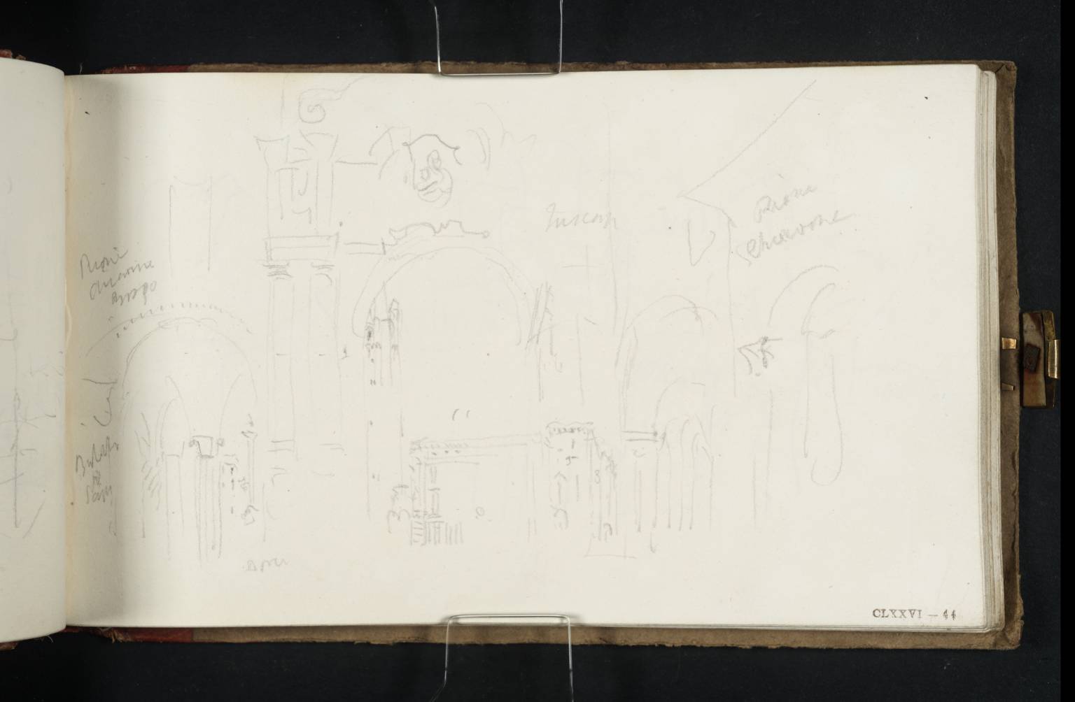 Inscribed by Turner in pencil ‘Rioni | A[...] | B[...]’ centre left, ‘B[...] | S[...]’ and ‘Doric’ towards bottom left, ‘Tuscan’ above centre, and ‘Rioni | [?Schiavoni]’ towards top right, on and around buildings