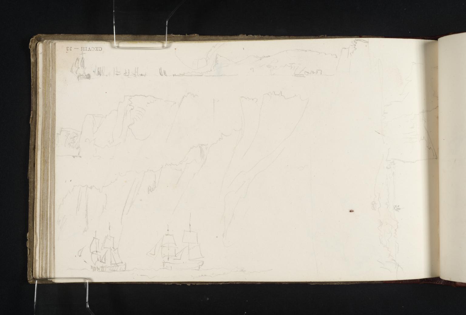 Above this a second sketch of coastal cliffs is rendered from a similar perspective. A succession of hastily arched lines appears to denote tufts of fine, loose turf that spill down and hang from their roots onto lower parts of the sharply descending slope. At the very top of the page is a more expansive, panoramic view of cliffs. Again these are observed from the sea, pointing to the fact that Turner made these drawings from the deck of a boat which itself was navigating choppy waters in the English Channel. This drawing reveals a great number of buoyant vessels to the left. One of these is markedly more detailed than the others, its sails individually delineated in their unfurled glory in the foreground. The rest of the ships float anonymously at a distance from the artist, but all are distinguished by tall masts. Towards the centre, at the top of the page, a small additional sketch is cordoned off. This appears also to be a minute rendering of coastal cliffs but is difficult definitively to identify.