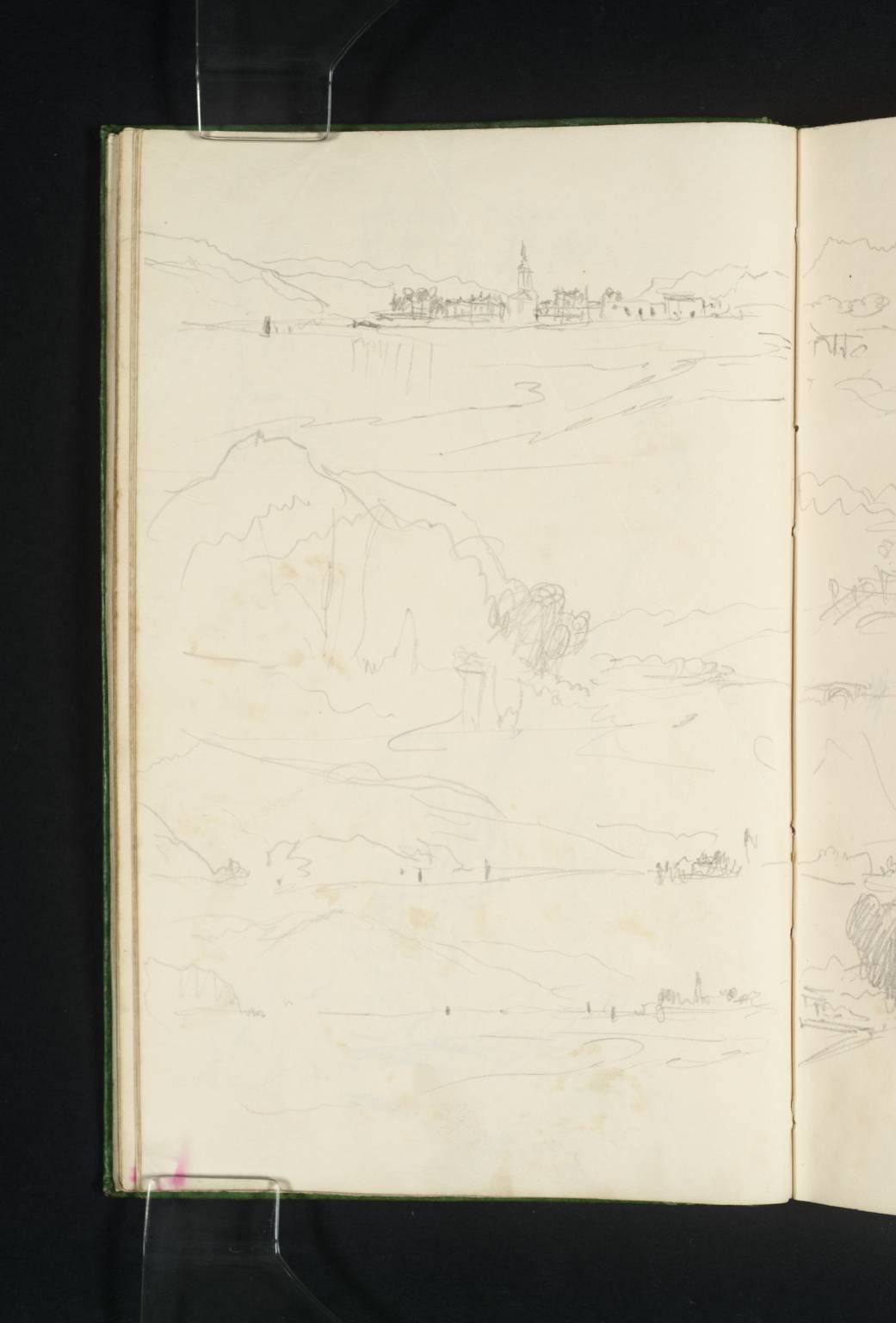 Turner first visited Loch Fyne in 1801 and returned twice in 1831, first during a round trip around the lochs of Argyll, and then on this journey to Oban via Loch Awe and Loch Etive.1 The present sketches across folios 19 verso and 20 (D26474) were probably made during this first trip, which was an advertised tour from Glasgow or Dumbarton to Loch Long and Loch Goil. The tour went by steamboat, by coach through Glen Goil to St Catherine’s, and across Loch Fyne by ferry to Inveraray. On Inveraray Turner joined another tour which took him through Glen Croe to the head of Loch Long and from here he returned down the length of the loch to Dumbarton.2
