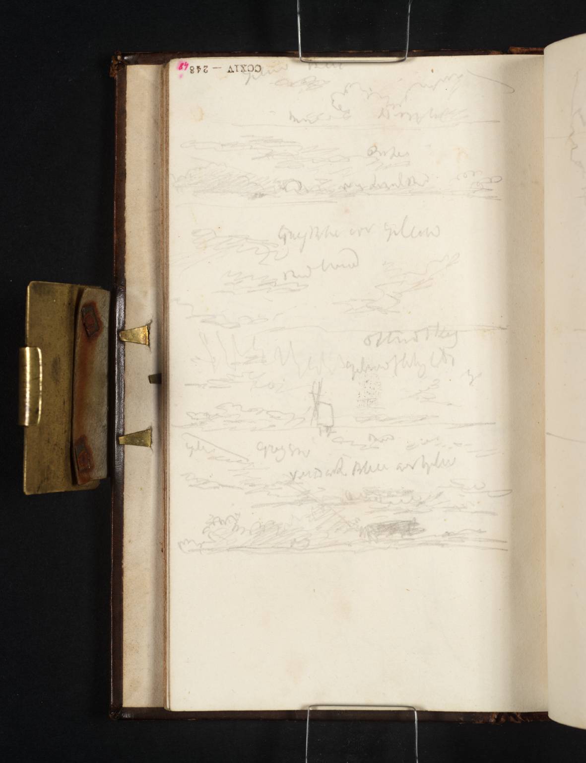 Inscribed by Turner in pencil ‘Yellow’ and ‘Blue’ top left, ‘Purple | [?sky Light] red’ towards top centre, ‘Grey Blue over Yellow | Red Cloud’ above centre, ‘o[...] Sky | yellow [...]’ centre right, ‘yellow’ and ‘Grey [?sky]’ below left of centre, and ‘Red | V[?ery] Dark Blue and Yelw’ below centre, towards bottom