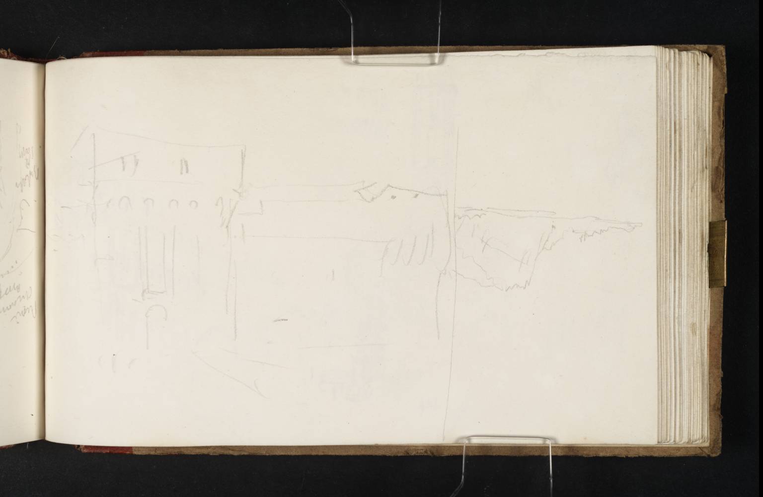 The outer third of the page is partitioned off by a vertical pencil line, with rocky cliffs or a headland somewhat randomly shown inverted relative to the other drawing. Forlimpopoli is roughly twenty miles from the sea at Rimini along Turner’s route, and the feature was presumably recorded somewhat later as he travelled along the Adriatic coast towards Ancona (see under folio 69 verso; D14614; Turner Bequest CLXXVI 65a). Compare the distant formation on folio 65 recto (D14613; CLXXVI 65).