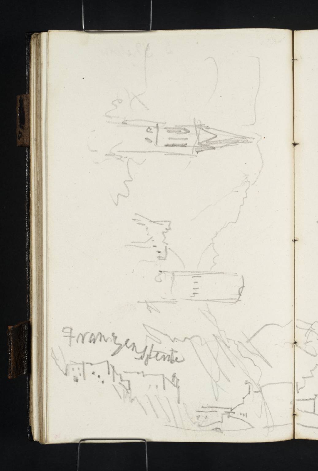 Below, apparently superimposed somewhat randomly somewhat later in the journey, is a view of the newly completed Franzensfeste fortress (Forte di Fortezza), clearly labelled by Turner; it continues across folio 25 recto opposite (D32209). Built by the Austrians between 1833 and 1838, the massive complex runs along the west side of the Iscaro (Eisack) Valley north of Bressanone (Brixen) in the Dolomites (see folio 31 recto; D32321), and south of the Brenner Pass ‘between Innsbruck and Botzen’ (otherwise Bozen or Bolzano; see folio 29 verso; D32318), as Finberg noted.1 In recent years it has been opened to the public and hosts arts events.2 Turner presumably sketched it as he travelled north-east from Bressanone to Brunico (Bruneck; see folios 34 verso–35 verso; D32328–D32330).