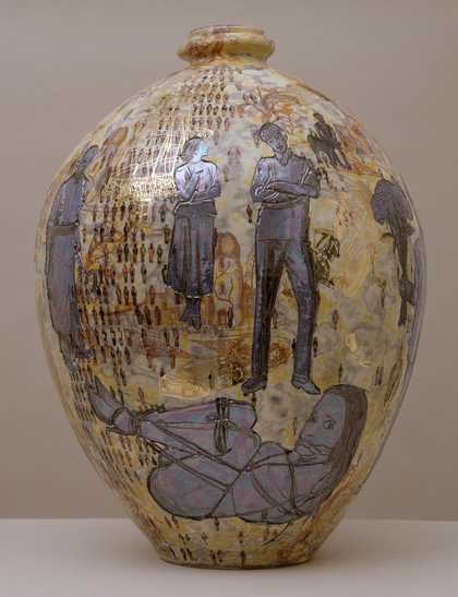 Grayson Perry decorates his ceramic vases and pots with illustrations that address issues of identity, class, sexuality and gender. Perry often dresses as a woman, changing his identity from Grayson Perry into ‘Claire’ his female alter ego. In Aspects of Myself he depicts himself as Claire.