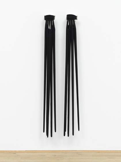 These are sculptures – or body pieces – by artist Rebecca Horn. The body pieces, which include gloves and masks, are designed to extend the human body and what it can do. Although these artworks were made to be worn in performances, she also sees them as sculptures. Detached from the human figure and mounted on the gallery wall they look disturbing, suggesting a terrifying absence (or presence!).