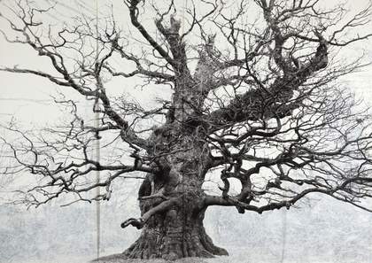 Tacita Dean’s work is created from a photograph she took of the majestic Fredville oak tree in Kent. This is one of the largest and oldest complete oak trees in England. She painted the area around the tree’s leafless branches and trunk white, isolating its structure and form. The weathered skeleton feels symbolic of the passage of time. It's an emblem of endurance and strength that has already seen many winters and will no doubt see many more.