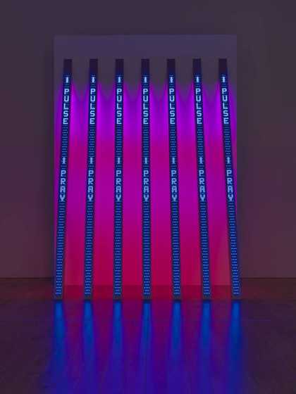 This critical reflection on modern society is also evident in Jenny Holzer’s work through her witty and provocative slogans which reference to everyday experiences and emotions. BLUE PURPLE TILT 1996 collates messages from the artist’s career, charting her development from the early Truisms and Survival series, including pithy texts such as “PROTECT ME FROM WHAT I WANT”, through to the anonymous declarations of the Inflammatory Essay and personal musings of Lamentations. Seven luminous LED signs are used to transmit her texts, emanating brightly and enveloping the viewer. The staging of her messages is central to Holzer’s practice, and serves to emphasise how language shapes our cultural environments.