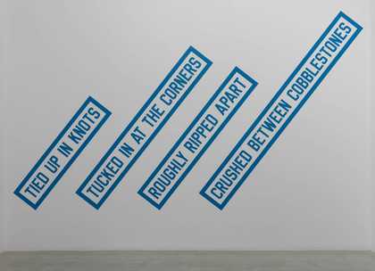 The Weiner works in the ARTIST ROOMS collection consist of a cycle of ten wall texts; each statement such as Tied Up in Knots 1988 and Roughly Ripped Apart1988 suggests a physical action or invoke the manipulation of an object or matter. Weiner regards his language works as sculptures, and they can be seen as instructions or propositions that could be enacted. These works are displayed as vinyl lettering applied directly to the exhibition surface. The artist’s aim is to offer a universal, objective experience in which the reader is invited to execute the work through his or her own imagination.