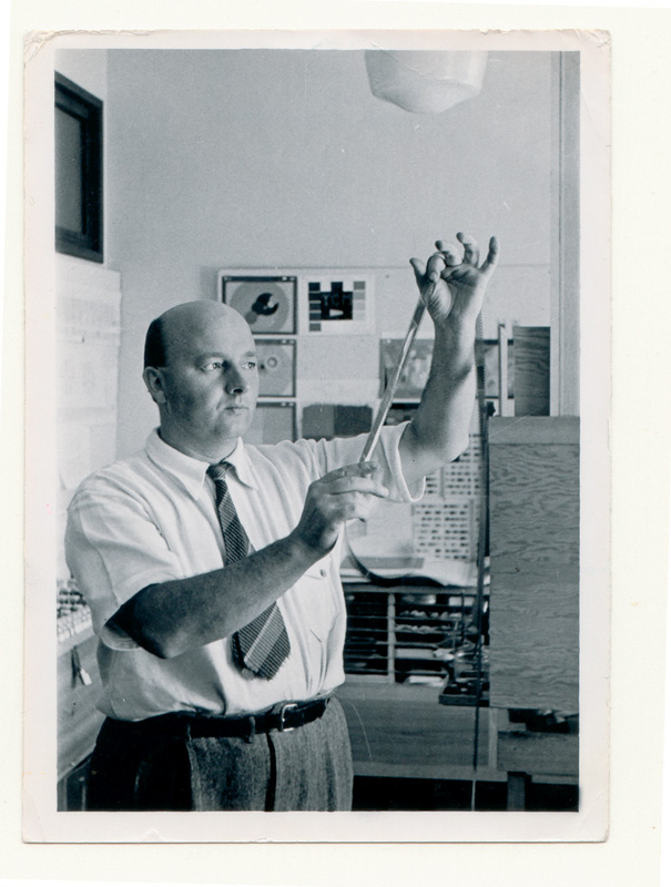Fischinger found work in the USA, where commercial film production thrust itself on him in its most unadulterated form. Walt Disney was planning an animated feature illustrating several pieces of classical music and engaged the conductor Leopold Stokowski, who knew that Fischinger had been making animations pegged to music for some time. Study no. 8 (1931), for example, devised images for Paul Dukas’s The Sorcerer’s Apprentice, a scherzo Disney would later use in Fantasia. Unlike Disney, Fischinger did not illustrate Goethe’s story, but rather translated the textures and movements of the sounds into spurting and tumbling black-and-white shapes. In 1938–9 Fischinger was hired by the Disney studio as a “motion picture cartoon effects animator”, earning $60 a week. Having animated the sparkle of the blue fairy’s wand in Pinocchio, and thereby converted his abstract powers directly into Disney magic, he produced sketches and try-outs for Bach’s toccata and fugue section in Fantasia. In one major sequence, turquoise and green-grey waves were superimposed by a flow of geometric figures in browns, orangey-red and yellow oranges. His twenty seconds’ worth of film was worked over by Disney staff and the shapes made simpler, for the assumption was that only then would audiences accept them. Just one figure moved at any one time, and in the background floated clouds in a sky. The non-figurative forms were concretised, conjuring up real-world objects. While Fischinger thought he was utilising the insights of the colour theory he had studied, Disney objected to too extreme a palette and altered the colours. Fischinger’s deformed contribution was set among kitschy images derived from jabbing violin bows, ethereal cathedrals and doomy shafts, with the anchoring spectacle of the black-suited conductor who marshals all this energy. Fischinger quit the film in disgust. Clearly still smarting from his experience a decade later, he reflected on the state of cinema, attacking the usual “photographed surface realism-in-motion” that destroys “the deep and absolute creative force”: