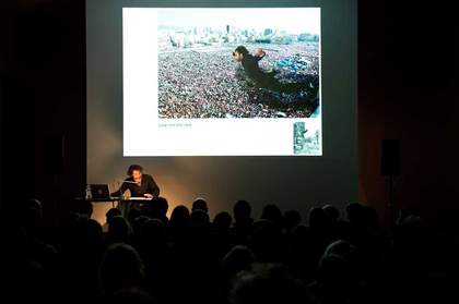 Theater with dirty feet – a talk on theater into art was a performance-lecture by the Lebanese artist Rabih Mroué. For an hour Mroué sat at a table facing the audience, illuminated by a lamp that also made visible his notes. Still images of his previous work and historical works that had influenced them were projected onto the wall behind him as he described and discussed them. He also projected – and read aloud – correspondence between himself and different interlocutors, making visible a back-and-forth dialogue around his works and the exhibitions in which they featured.
