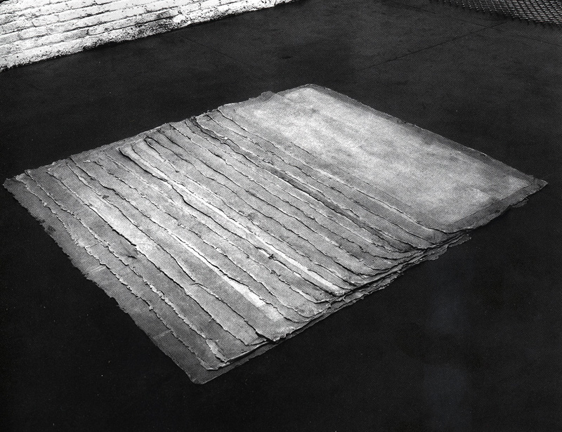 That meaning lies in how Hesse engaged material has been part of the artist’s critical reception from the onset of her work in sculpture. Rosalind Krauss, for instance, has characterised Hesse as working counter to the ‘formalist dialogue of the 1960s with the message of expressionism … ‘manifested through the experience of matter itself.’30 In 1968 Robert Morris included the artist in his Anti Form exhibition at the Castelli warehouse know as ‘Nine at Leo Castelli.’ Morris showcased work generated through a ‘direct investigation of the properties of … materials’ for which there was no predetermined form and thus, ‘random piling, loose stacking, [or] hanging [gave] passing form to material.’31 Hesse contributed Augment and Aught, the former (fig.11) consisting of nineteen sheets of latex-infused canvas layered upon one another and installed on the warehouse floor. Also represented in the show was fellow-Albers-student and Hesse’s friend, Richard Serra, who created his legendary piece Splashing (fig.12) for the exhibition by throwing molten lead against a wall, allowing the work to assume its own form.32 According to Robert Pincus-Witten, in the late 1960s Serra was teaching at Queens College. About his teaching method, Pincus-Witten recalled what to my ear is at its core quite reminiscent of Albers and Bauhaus pedagogic practice. He stated: