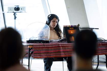 Closing the session, Tara Al Dughaither presented a live set comprising a sonic dialogue with an aged vinyl record from southern Iraq. Never having lived in Iraq, her impressions of it are dreamed through memories, shared by her mother and grandmother, of gardens, community and the distant joy of the past. She described the vinyl as being ‘like a body’ with its own grooves and imperfections, while the soundtrack’s vocalist sang about the pain of separateness. The artist mentioned she has deliberately refrained from trying to trace the record’s exact origin, preferring to keep that connection speculative and sonic. Using a synthesiser, she warped the recording, stretching the haunting voice of the male vocalist into ethereal, temporally distant echoes. Meanwhile Al Dughaither layered on her own, responding voice, eliciting its own reach across time and space as a form of live ecstatic feedback.