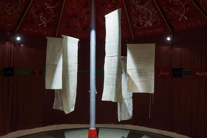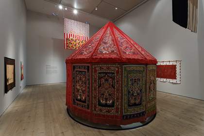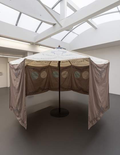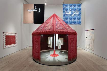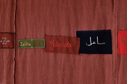 A Day is as Long as a Year 2022 is an embroidered tent installation by the Lebanese artist Mounira Al Solh (born 1978), produced in collaboration with women from Afghanistan, Lebanon and Iran (fig.1). Inside the tent, the Arabic word al-iztīāḥ, which translates to ‘displacement’, is sewn in black and white thread alongside floral and avian motifs, reminiscent of Iranian carpets and regional Islamic ornamentation across Lebanon and other parts of West Asia (fig.2).1 Elsewhere in the tent, fabric panels varying in size and colour display the names of the women who collaborated with Al Solh – ‘Zeliha’, ‘Gigi’, ‘Yolanda’ and ‘Sahel’ – while larger suspended panels carry the women’s testimonies (fig.3).2 Hidden speakers play Arabic words drawn from the tent’s inscriptions, recited by the Lebanese singer Rima Khcheich. This is accompanied by Iranian songs of mourning performed by Iranian women.3 Stitched among names, other words and phrases as well as patterns, the word al-iztīāḥ comes to signify a shared cultural experience of loss and movement.