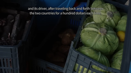 The film Now Eat My Script 2014, which reflects on the exchange of goods and foods between Syria and Lebanon during periods of conflict, exemplifies Al Solh’s interweaving of personal memory with reflections on the war and displacement (fig.4). Narrated by a fictional pregnant writer who struggles with the ethics of recounting violence, the film follows the narrator’s aunt as she transports a sacrificial lamb across the Syrian-Lebanese border. While the voice over evokes scenes of domestic life – family gatherings in kitchens and living rooms and the preparation of food – the camera focuses on cars, crates filled with vegetables and the lamb’s carcass. The tension between voice and image unsettles the boundaries between nourishment, ritual slaughter and the violence the narrator struggles to represent, alluding to the brutality of war while refusing – and explicitly critiquing – the voyeuristic display of traumatised bodies.