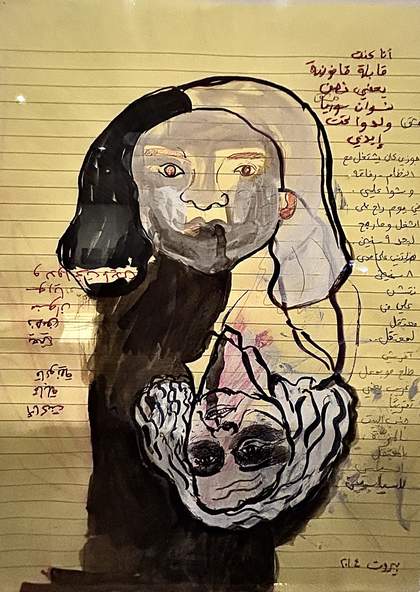As Hartman’s concept of critical fabulation suggests, testimony is revealed through gaps, fragments and ruptures that resist consistency. In I Strongly Believe in Our Right to Be Frivolous, the artist listens to each speaker’s experience while allowing their silence to shape the work, making space for their story without imposing a coherent narrative. Numerous interlocutors speak of their loss or happiness in a fragmented manner. In one example the faces of two women are joined vertically with a younger woman’s likeness at the top, and the face of an older woman with white hair and rings around her eyes, in the inverted position (fig.12). The women are outlined in black ink and are loosely filled with shades of brown, pink, and grey. Their faces are framed by phrases handwritten in Arabic that document the experience of a Syrian midwife, now a refugee, who shares that: