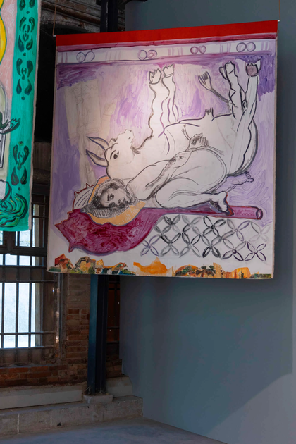 In A Day is as Long as a Year and I Strongly Believe in Our Right to be Frivolous ornamental flora and fauna reappear like refrains. In A Dance with her Myth 2024 (fig.13) Al Solh transfers this logic to a multimedia installation that reinterprets the story of the abduction of the Phoenician Princess Europa by Zeus, who disguised himself as a bull and carried her away on his back (fig.14). Through drawings, paintings, sculptures, embroideries and video the work challenges traditional depictions of women in mythology and reframes them as empowered figures.