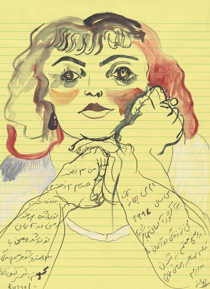 Darwish’s declaration affirms Palestinians’ and other displaced people’s right to happiness and complexity, even as they are placed under duress. Al Solh’s materials – ink, watercolour, pencil and marker on yellow, lined paper – render this sentiment tangible. The portraits are drawn and annotated from real-time conversations between the artist and the participants, turning note-taking into a gesture of solidarity.33 Each work, which combines a drawing and a testimony written in English, Arabic or French, is created in one sitting.