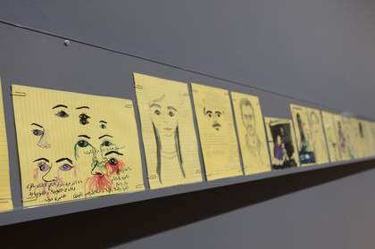 Al Solh’s yellow, lined paper recalls administrative forms, particularly asylum paperwork. The legal pad is the material of bureaucratic processing: the form that categorises, assess, grants and refuses. Al Solh takes a surface designed to reduce a person to their legal identity and repurposes it to record their complexity. Together, the drawings create a constellation rather than a chronology: a non-linear archive in which the administrative paper becomes a space of memory and agency rather than control. This is a politics of drawing as listening, allowing voices to appear within rupture and emotion. Not all grief is spoken.