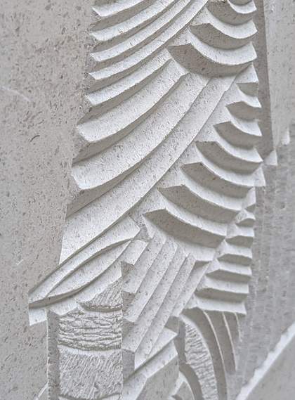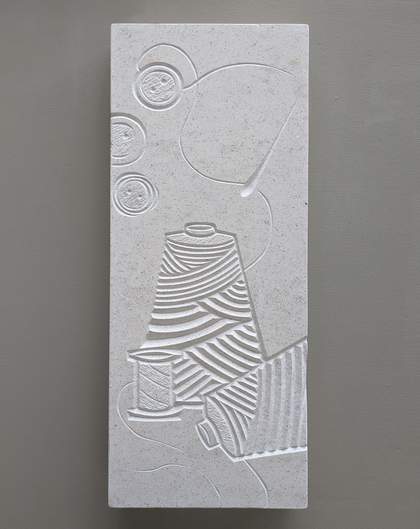 Thread Memory 2023 is a hand-carved stone depicting spools of thread, buttons and flowing thread lines (figs.4–5). When making this work, I focused on small, humble objects that my grandmother used daily but that are easily overlooked: thread spools, buttons. I drew these directly onto the limestone with chalk and charcoal, repeatedly marking and erasing until the design emerged. I chose limestone both for its softness and responsiveness to fine carving, and for its permanence, making fragile textile motifs endure in a material associated with architecture and monuments. The stone was carved using a mallet and chisel. The carving process mirrored embroidery itself: repetitive, meditative and patient. Each groove represents a stitch, building the image line by line. Thread Memory is the only stone carving I have completed, although I plan to create more. The work was eventually sold.