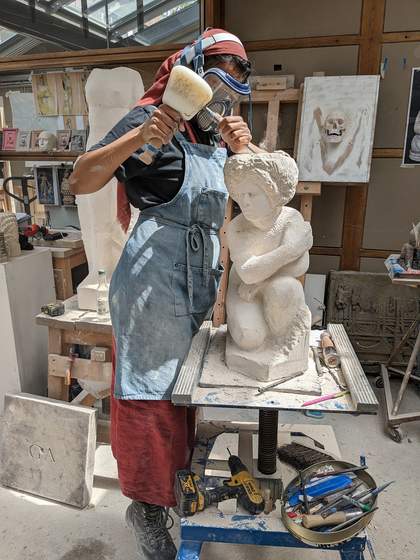 I trained in Historic and Architectural Carving at City & Guilds of London Art School between 2021 and 2023 (figs.1–2) and in my final year I was awarded a scholarship to complete a year-long programme at the Florence Academy of Art, where I focused on anatomy, gesture and the capturing of the human form in clay and drawing. My approach is shaped by my training at City and Guilds of London Art School, where I studied under the artist and memorial carver Charlotte Howarth. Translating private, gendered subjects – domestic objects, women’s undergarments and the material culture of women’s lives – into monumental forms, Howarth challenges the division between domestic life and public memorial.