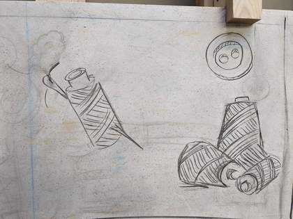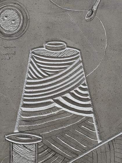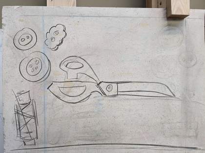 Unlike the highly elaborate designs that stone carvers traditionally prepare before working on the stone, my charcoal drawings function more like a thought process than fixed blueprints. They are exploratory spaces where motifs emerge – threads, scissors, buttons (figs.6–7) and sewing machines – rather than detailed designs to be transposed onto stone. This way of working gives me freedom and allows for fluidity and intuitive discovery, which later informs the physical carving.