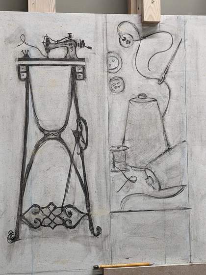 In two preliminary charcoal drawings made in 2023, made directly on stone surfaces as opposed to paper, the process involved repeatedly drawing, erasing and redrawing on the stone until the composition began to emerge. I have also explored the relationship between the sewing machine, a technology that has both liberated and constrained women, and the hands that operate it. The shape in my sketch is unrealistically long and forms a silhouette similar to an hourglass (fig.8). This design was originally developed as a study for a stone carving, which was never realised due to time constraints. I continue to consider carving a related form in my future work.