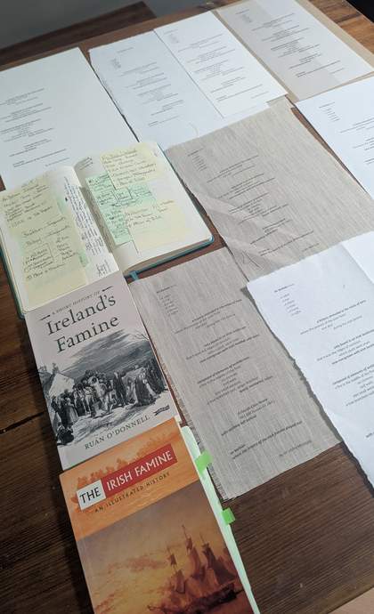 In 2024 the installation When Only Words Are Left, They Mean Everything 2024, which comprised paintings, etchings, plates and sculptures alongside archival photographs, census extracts and passages from Famine-era testimony, was exhibited at Gallery North, Northumbria University (fig.21).43 It was curated as part of the exhibition What Are Words Worth?, which explored how language operates as both evidence and absence. In the installation historical texts served as prompts for material investigation; language, image and object were brought into dialogue, drawing attention to both the symbolic and affective force of what can be recorded and the silences produced by what remains absent.