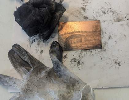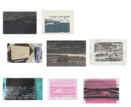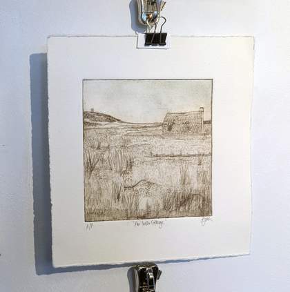 The drypoint print An Irish Cottage 2023 was included in a 2025 studio members’ exhibition at Northern Print, Newcastle, which foregrounded small-scale trial prints and proofs (fig.22).44 This early test piece emphasises process over resolution, revealing the iterative labour involved in translating archival fragments into form.