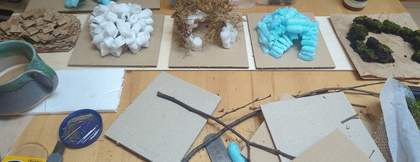Material tests with recycled card, packaging material, moss and soil, 2025