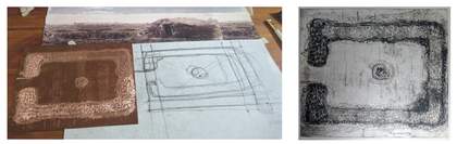 The project employs archival traces in the studio and the exhibition space; engravings, photographs and testimonies are re-sited as testimonial anchors and objects of contemplation. Arranged not as aesthetic objects but acts of confrontation and remembering, these curatorial fragments allow us to reimagine an bothán through lived experience, to examine its fragile architecture and to reflect on the partial records of the site.39 Speculative prose, prints and maquettes sought to inhabit the sensory world of an bothán (figs.11–13). Early experiments in the studio of pencil and ink drawings and monoprints based on archival photographs sought to reconstruct an bothán with architectural precision. Collage and model-making were used as a method of layering landscape with man-made structures. These pieces, while technically resolved, appeared too fixed, echoing the illustrative conventions of Famine-era representations rather than the dwelling’s fragility. An iterative and cyclical practice was employed, defined by the philosopher Donald Schön as ‘reflection-in-action’, a process in which the practitioner ‘surfaces, criticizes, restructures, and embodies in further action the understandings implicit in the work’.40