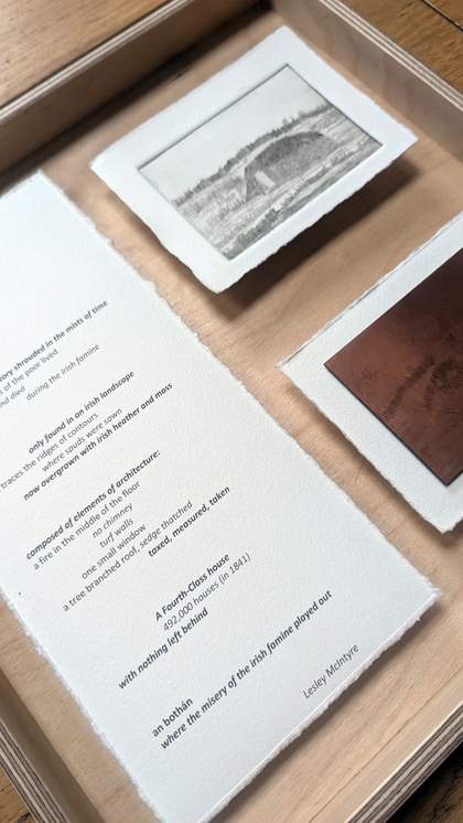 Birch-plywood box frame coated in osmo wood oil with prose printed on Hahnemühle paper, copper drypoint etching plate with etch of An Bothán mounted on Hahnemühle paper and drypoint print of An Bothán on Hahnemühle paper