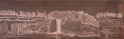 The drypoint copper plate Lines of Fragility 2024 depicts the bowed outline of an bothán (fig.18). The reflective surface of the work causes the image to flicker in and out of visibility, contrasting the permanence of copper with the vulnerability of the dwelling it records. Developed from the photograph Ardee Bog (see fig.3) and the illustration A Connemara Cabin (see fig.5), the work transforms documentary intent into a tactile, hesitant study. Lines of Fragility acknowledges the impossibility of preservation while resisting permanence as an authoritative mode of representation. The tension between durability and fragility is central to the work: the medium’s capacity for endurance and reproduction stands in contrast to an architecture that left almost no trace, so that the act of printing becomes a form of insistent, if provisional, recovery.