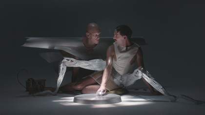 Ismaili’s wider practice explores the transformational potential of queer bodies and spaces. Drawing on fictional, historical and personal references, their performances or installations construct speculative worlds populated by alter egos, body extensions and wearable musical instruments. In their performance LYNX 2022, Ismaili contended with the body as a site of transformation, drawing on the figure of the endangered Balkan wildcat (fig.14). The performance examined violence, restriction and perseverance while imagining different forms of embodiment. In the closing scene, joined by their sister Blerta Ismaili, the artist spun a tepsija in the centre of the stage while the two performed a song written by their mother. Reflecting on LYNX and their commission for the Biennial, Ismaili explained that the work is a way to subvert gender norms, since the tepsija is only played by women.