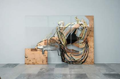 POČIMALJA was one of the first works visitors experienced as they walked into the Biennial (fig.4). Drawing on her 2022 iteration of the project, Raščić created a kinetic sculpture that mimics the spinning motion of a tepsija, its resonance providing a soundscape for the exhibition space. Once visitors were drawn in by the spinning plate, they discovered two more components of the work: a series of silkscreen prints installed on a shelf on one gallery wall, and a large triptych of gold, silver, copper leaf and paint on glass, presented on the floor, leaning against an adjacent wall. The prints provided historical context to the project, reproducing illustrations and visual material related to tepsijanje from the guidebook Folk Traditions in Yugoslavia: Ten Tours (1970) by Leposava Zunic-Bas (fig.5). The three glass panels, which depicted a tepsija player from one of the prints, enlarged, fragmented and expanded this iconography into a reflective surface (fig.6).