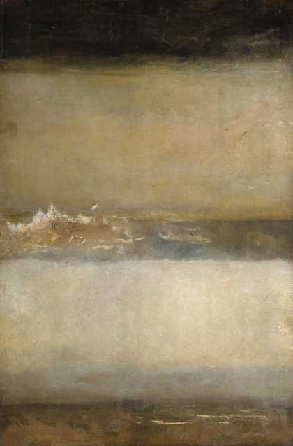 In Turner’s picture, Dutch Boats in a Gale: Fishermen Endeavouring to put their Fish on Board (Bridgewater Sea Piece) 1801, there’s a pervasive sinking feeling, as if this were the damned side of a Last Judgment. As so often in his “imitations”, the horizon line is much higher, which here pulls us closer to the waves, and makes them both more abundant and enveloping. The two ships seem on the verge of colliding, and the browny-gold moistness of the storm clouds has been absorbed by the sails of the foreground ship as if they were made of blotting paper. Turner’s sailors seem bedraggled, like so much wet laundry – and a pile of white fabric does indeed lie by the tiller. Whereas van de Velde’s rigging is an idealised abstraction, Turner’s is anthropomorphised into a gesticulating skeletal stick figure, clothed in a pale sheet: the boom is an outstretched arm with a pointing finger; the mast a spine; the flag a head. It is already a ghost ship.