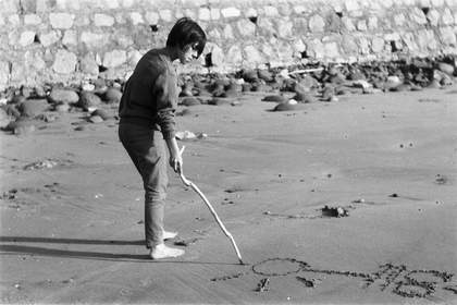 Cecilia Vicuña drawing in the sand on a beach in Concón, Chile, 1966