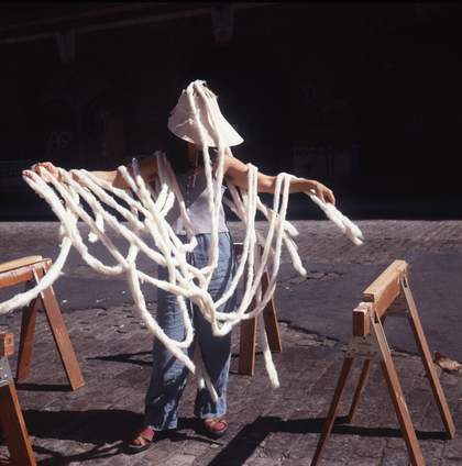 Cecilia Vicuña performing cloud-net on the street in New York, 1999
