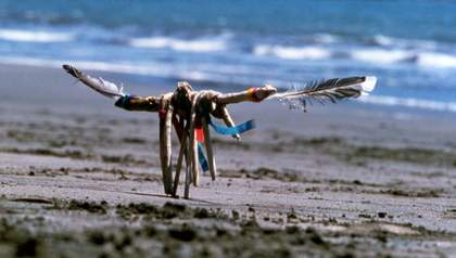 Cecilia Vicuña’s mixed media sculpture Guardián 1967 on a beach in Concón, Chile, which was later erased by the incoming tide