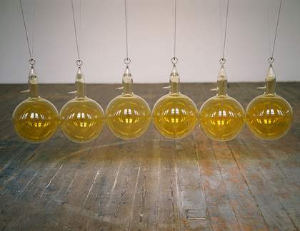 Looking at photographs of the two major installations Butt produced in his short life – Transmission 1990 and Familiars 1992 – you could be forgiven for thinking you were looking at the laboratory equipment of an experimental chemist, or prototypes from the studio of a strange, cryptic engineer. Transmission consisted of a ring of glass books lying on the floor in a darkened gallery, each illuminated by a blue neon spine and watched over by a single glass vitrine in which flies hatched from eggs, consumed paper drenched in sugar, and then died. Familiars was made up of three glass and metal sculptures, each containing a different halogen element: there was chlorine in transparent spheres, evoking a chemist’s mixing flasks; iodine in glass tubes shot through with glowing wire; and bromine in the transparent tips of three curving poles that resembled a massive set of tweezers.